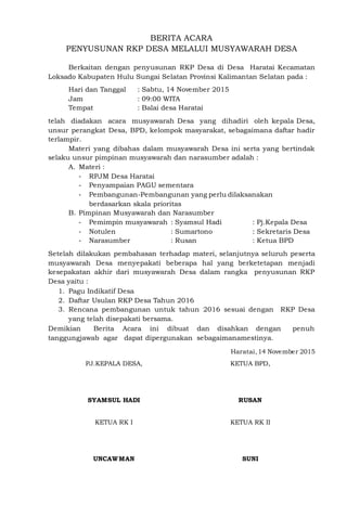| Kop | Nama Desa, Nomor dan Tanggal BAMusDes, Nama Ketua Musyawarah |