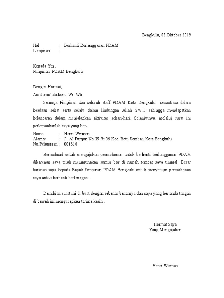 - Perihal: Tuliskan "Pemutusan Layanan Air PDAM".