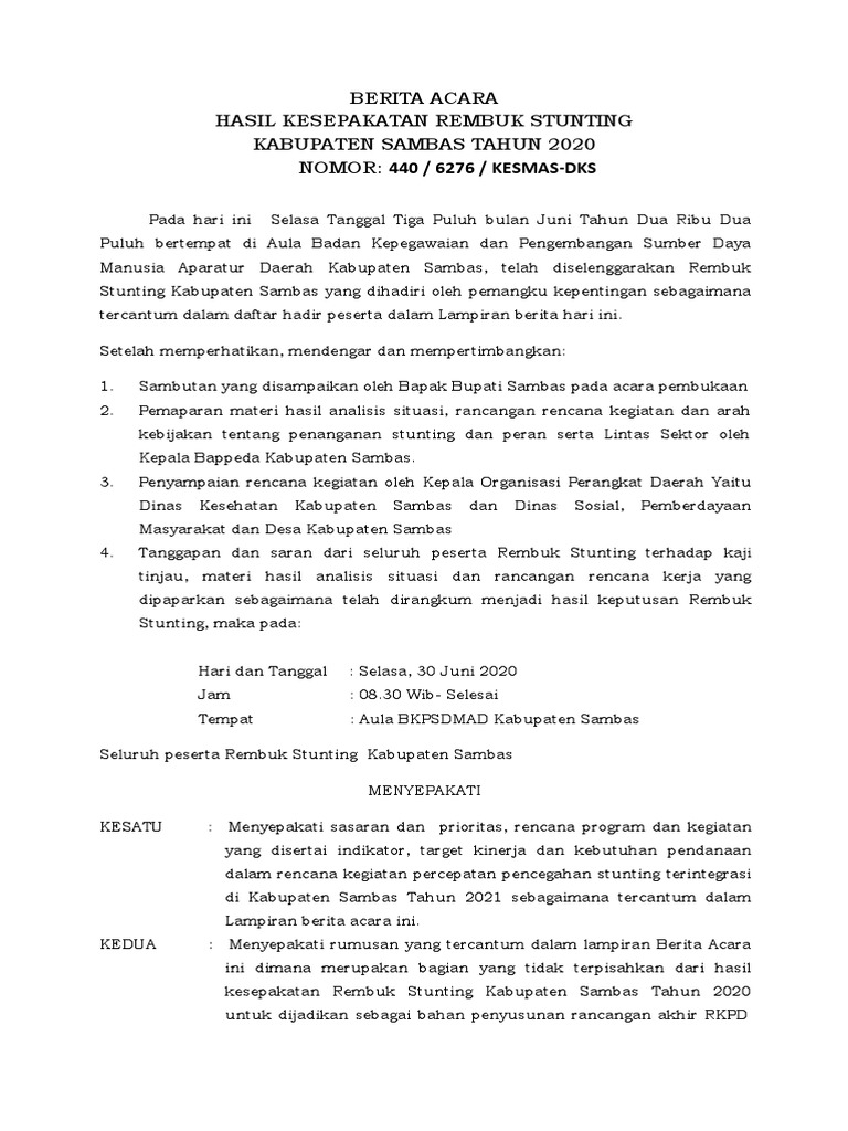 Stunting, kondisi gagal tumbuh pada anak yang disebabkan oleh kekurangan gizi kronis, merupakan permasalahan kesehatan masyarakat yang serius di Indonesia. Untuk mengatasi permasalahan ini, pemerintah telah menginisiasi program rembuk stunting sebagai wadah koordinasi dan sinkronisasi upaya penanggulangan stunting. Berita acara rembuk stunting merupakan dokumen penting yang merekam hasil pembahasan dan rekomendasi yang dihasilkan dalam kegiatan tersebut.